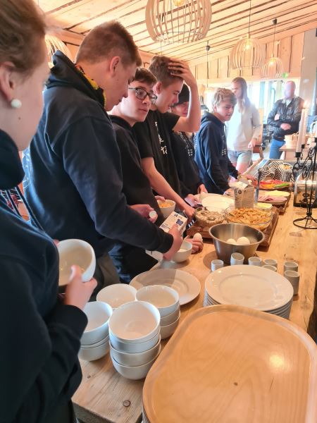 Peter välkomnade skolklassen vid deras ankomst och assisterade ungdomarna vid incheckning till vår dubbelkåta och föräldrar/lärare i våra vildmarkspanelrum där natten skulle spenderas innan hela klassen med lärare/föräldrar kunde samlas vid vår grillplats med tak som har den vackra utsikten över Änghultasjön för tillagning av grillkorv på grillen som Corinna under förmiddagen hade förberett.