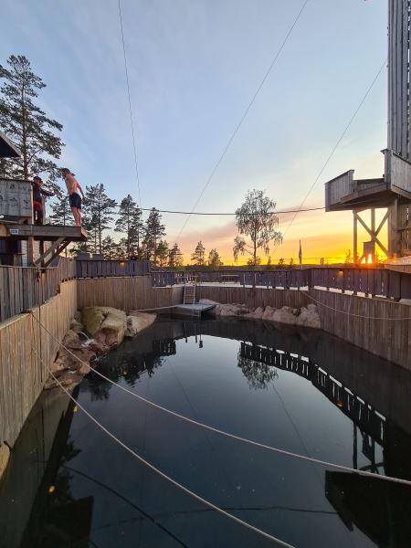 Efter den mättande lunchen var det dags att ge sig ut på högre höjder i vår Svarta bana, det blev tre grupper som gav sig ut med Patrick, Fares, Mohanad, Leo, Corinna och Hugo som deras guider. Då det inte är varje dag som man står runt 17 meter över mark och ska kliva ut från ett trappsteg så var det en del skrik som kunde höras, glatt skrik såklart!